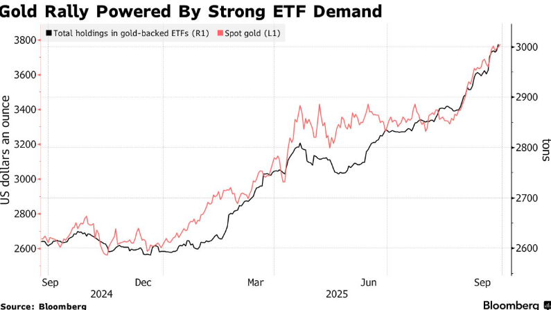 今年黄金涨幅已超40%,在央行购金需求与美联储重启降息周期推动下接连创出新高。金价有望实现连续第三个季度上涨,黄金ETF持仓量已达2022年以来最高水平。高盛集团与德意志银行等机构均预期涨势将持续。