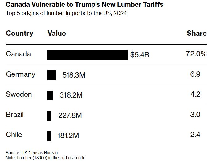 作为美国最大木材供应国,加拿大将受到严重冲击。该国目前已面临35.2%的反补贴关税,而其对美木材供应约占美国市场的五分之一。尽管特朗普声称美国不需要加拿大木材,但现实数据表明其仍占据重要份额。