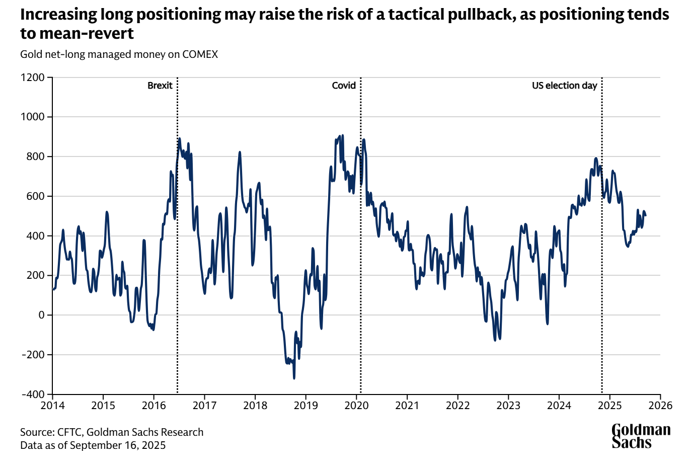 高盛研究部认为,金价超预期上涨的风险,要大于低于预期的风险。不过托马斯也指出,看多仓位的增加(即押注金价上涨的头寸增多)“可能引发短期回调风险”,因为从长期来看,投机者的黄金净持仓往往会向均值回归。