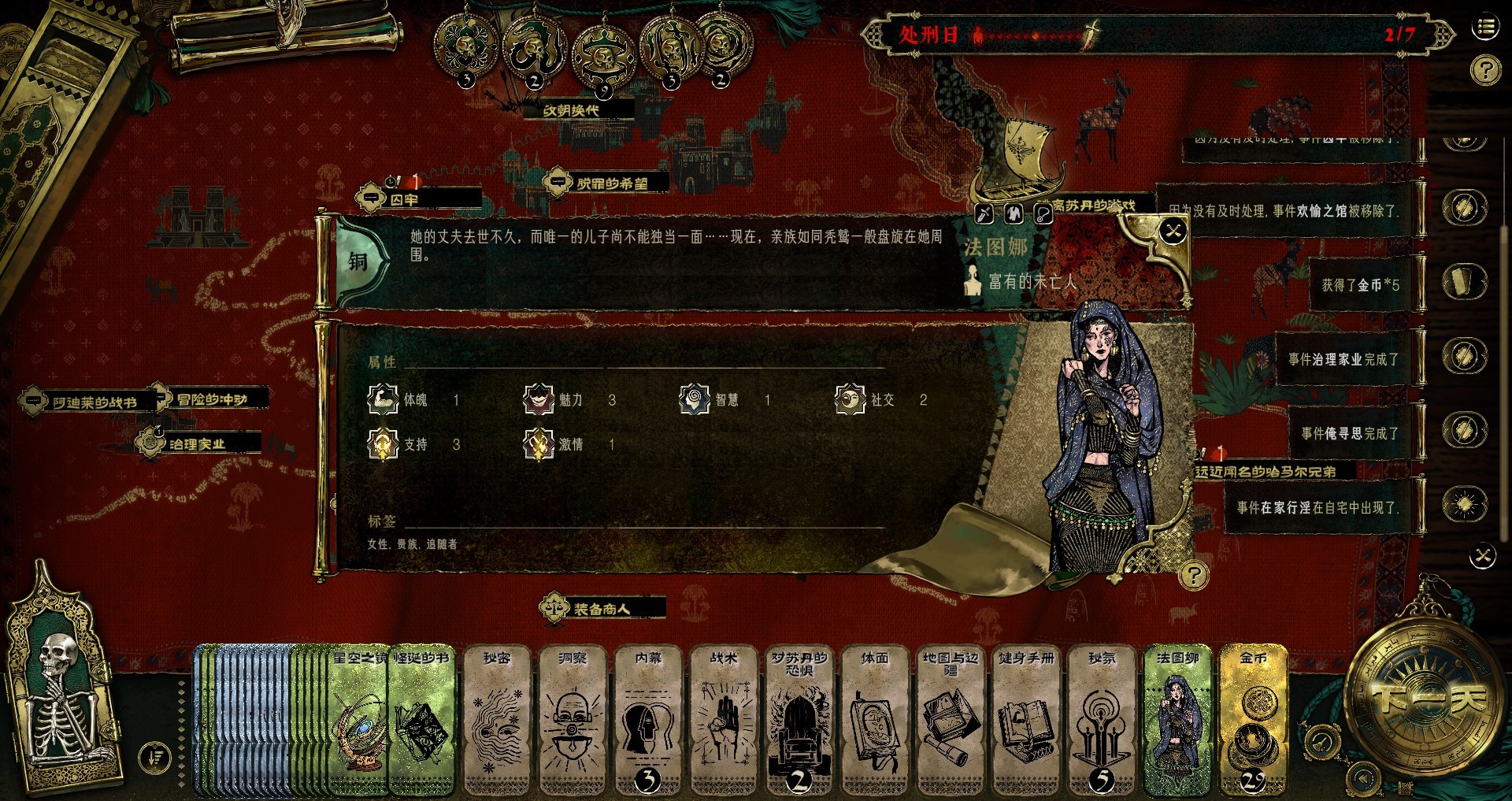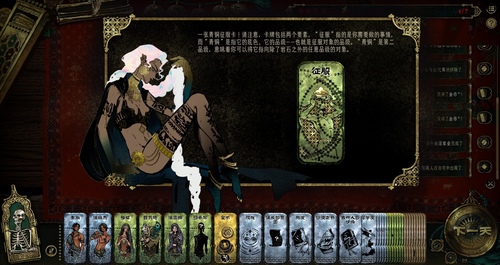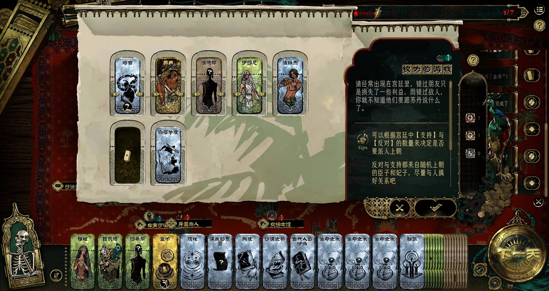 在《苏丹的游戏》中,玩家将扮演苏丹的大臣,身处一个充满《一千零一夜》风情的奇幻世界。每周,苏丹会要求你从四种卡牌中选择一张,并在限定的七天内完成卡牌上的挑战,否则你将面临斩首的命运。挑战的卡牌种类包括:追求欲望的“纵欲卡”、追求奢华的“奢靡卡”、征服险境的“征服卡”、以及需要献祭生命的“杀戮卡”。每张卡牌背后都是极大的代价,玩家既可以巧妙利用这些考验来实现自己的目标,也可能因此陷入危险的漩涡。