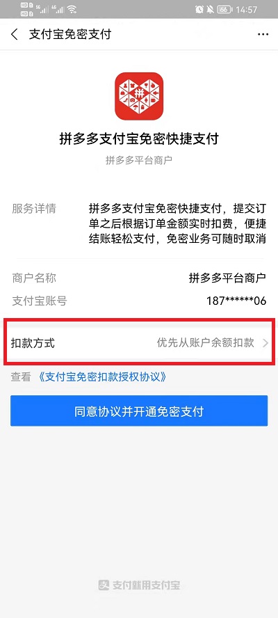 2、在支付宝中也是同样的扣款方式,也是可以设置扣款的方式,可以从相应绑定过的银行卡和余额,在开通时我们可以选择不同的扣款方式。