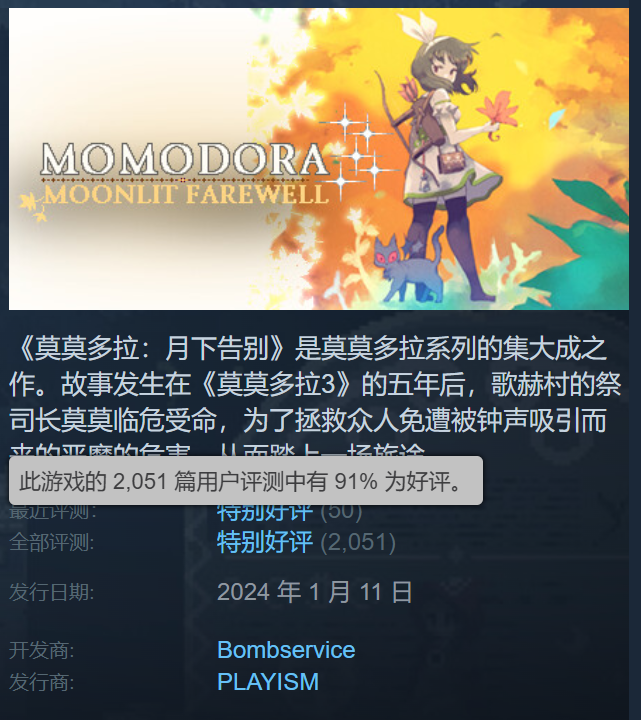 截稿之前,《莫莫多拉: 月下告别》在Steam平台全部评测为特别好评,2051条用户测评中,好评率高达91%。