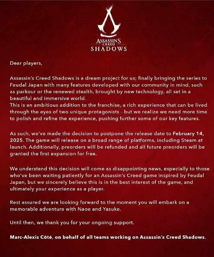 根据育碧发布的公告,《刺客信条:影》将推迟至2025年2月14日发售(原定11月15日),推迟原因为进一步完善游戏体验和关键功能;届时还将同步推出Steam版。此外,所有目前预购订单将被退还;未来预购的玩家将免费获得本作的第一个扩展包。