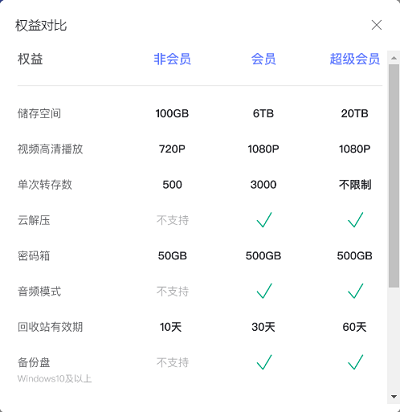 如果你是普通用户,也就是非会员,那么你可以享受到50GB密码箱、100GB存储空间、720P高清播放。