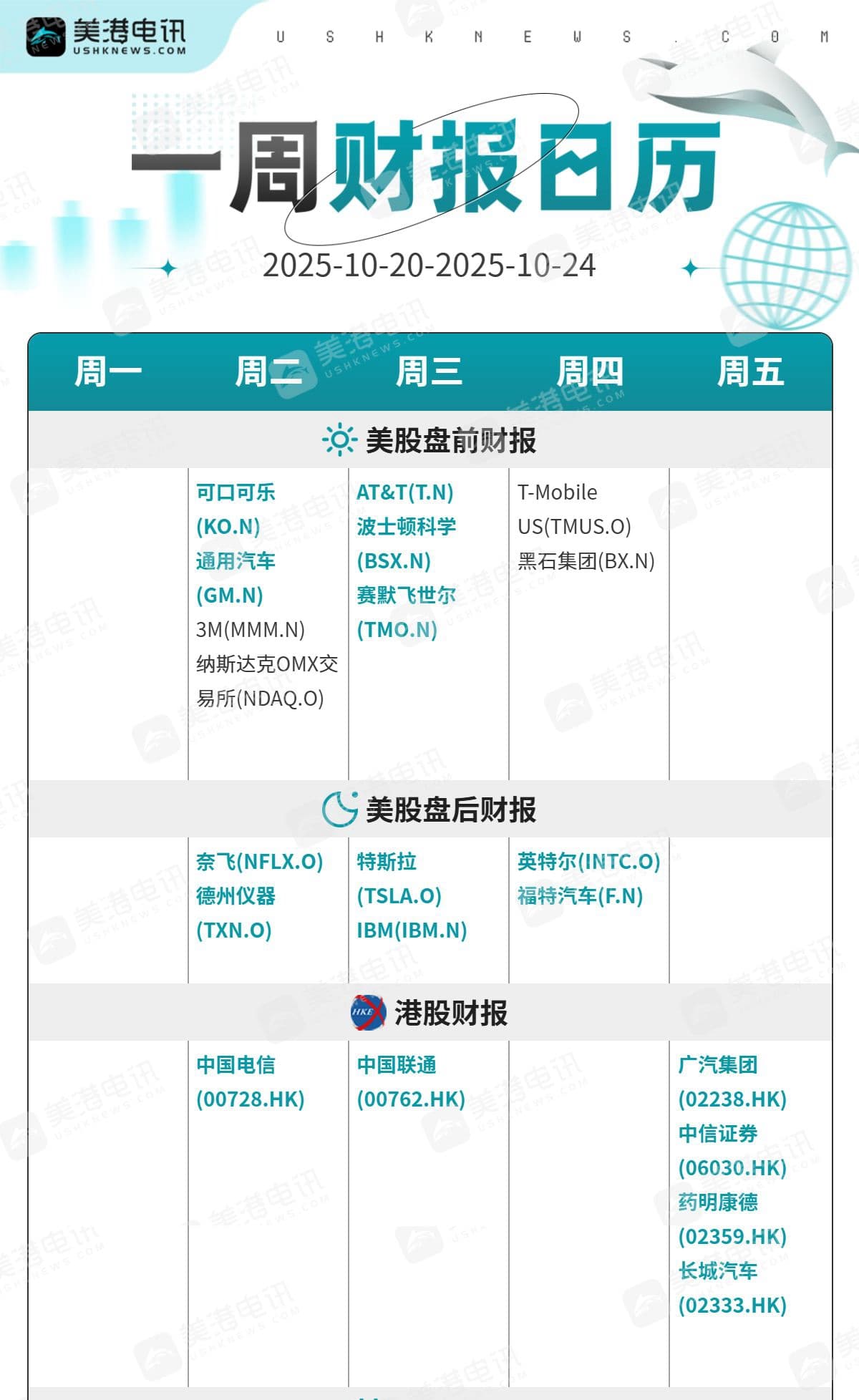 美股Q3财报季来袭,特斯拉(TSLA.O)、英特尔(INTC.O)、AT&T(T.N)等将于下周放榜。港股方面,中国电信(00728.HK)、中国联通(00762.HK)、广汽集团(02238.HK)等也将公布业绩。