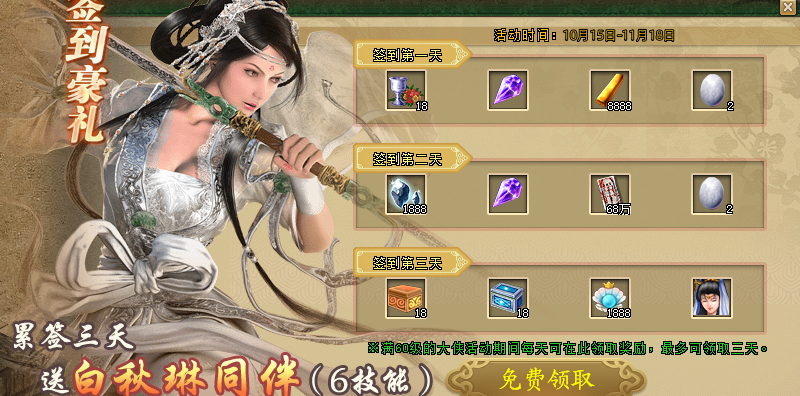 新服开启,签到打卡不仅可以领取大量的物资奖励,还可额外获得稀有的强力同伴:白秋琳(6技能),伴随大侠开启新的江湖人生!