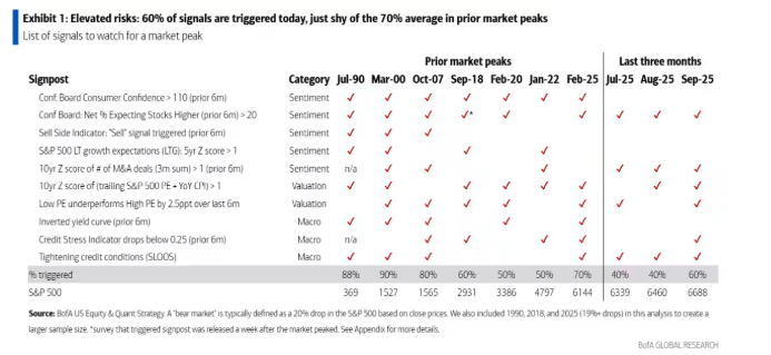 美国银行团队跟踪了10项“熊市信号”,而根据萨布拉曼尼安的说法,这些信号曾可靠地预示过往股市峰值。