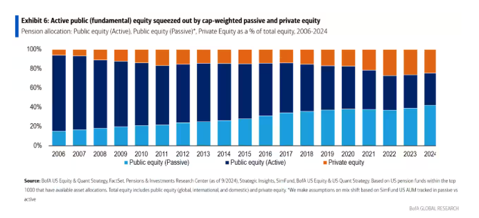 萨布拉曼尼安表示,美国资产所有者在很大程度上已将主动股票基金替换为“杠铃策略”——即主要通过指数基金持有标普500指数,同时配置私募股权。