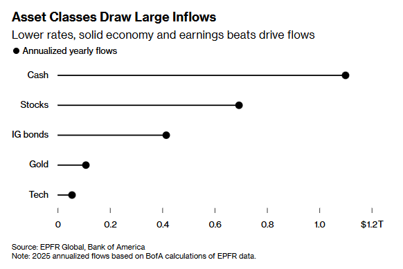 在传统资产类别相关性破裂的市场环境下,股票、现金、黄金和债券正迎来有史以来规模最大的年度资金流入之一。