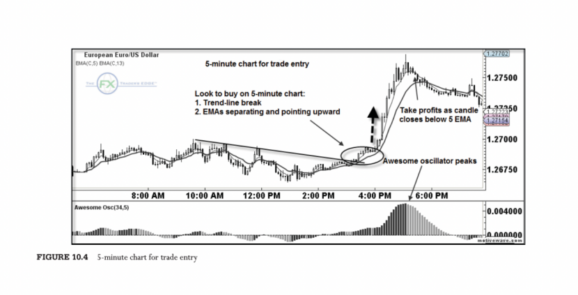 最后,交易员执行他的交易。他在5分钟图(图10.4)上按照1小时和15分钟图的方向进行交易。根据他的退出规则,他在蜡烛收于5 EMA下方时获利。