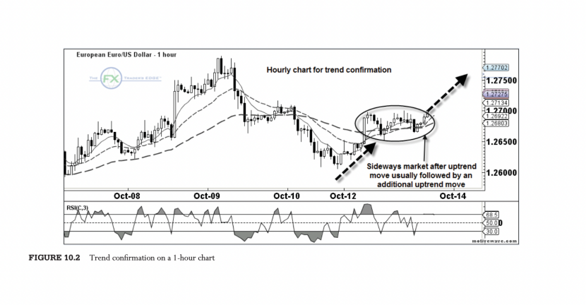 他将时间框架下移至小时图(图10.2)以确认趋势。该图显示在最初的上升趋势之后出现了一个横盘,而在这之后通常会有一个与第一次移动幅度相同的额外上升。这被称为平等的移动,交易者可以测量第一个趋势的距离,并推算出横盘修正后第二个趋势的等距离移动。