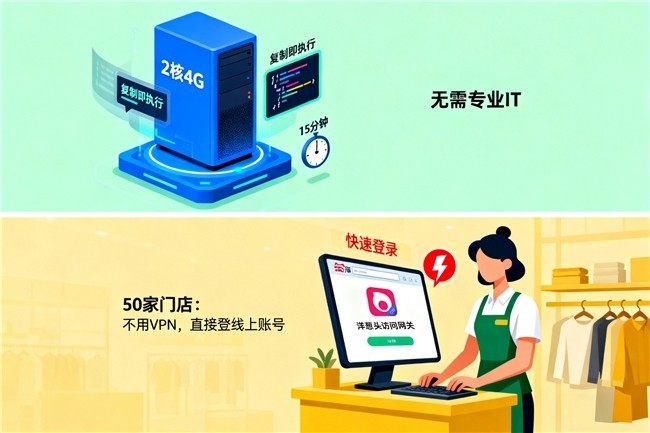 客户场景:某国内连锁服装品牌,线下 50 门店,线上有天猫、京东旗舰店,还有私域小程序。之前想做账号统一管理,找外包部署工具,光调试服务器就花 3 天,还得请专职 IT 维护,成本高不说,门店员工要登线上账号,还得先连 VPN,网速慢还总断,关键时刻经常掉链子。