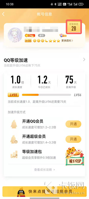 3、进入账号信息页面后,可以看到你的QQ等级,点击右上角【好友排名】;