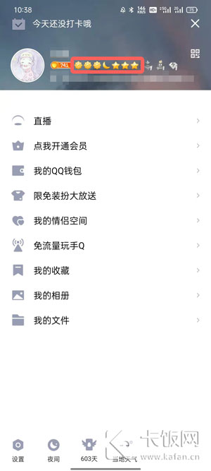 2、打开手机上的QQ后,点击左上角的头像进入左侧菜单后,点击你的皇冠/太阳/月亮/星星等级;