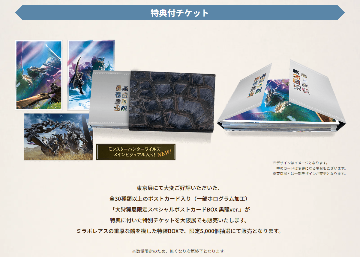 本次大阪场展览将提供“周年纪念剧场”、“武器投影”、“装备互动”、“怪物百科AR体验”、“黑龙入侵”以及大狩猎展纪念周边商品的销售等内容,但此前东京场的真实比例大太刀“狐刀カカルクモナキ”和等身雕像“セクレト等身大フィギュア”不会展出。