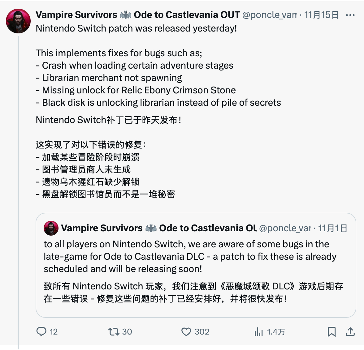《吸血鬼幸存者》新DLC“恶魔城颂歌”近日在Switch平台上线。尽管该DLC中存在一些BUG,开发团队Poncle已迅速发布补丁,修复了包括加载特定关卡崩溃、图书馆商人未生成等问题。