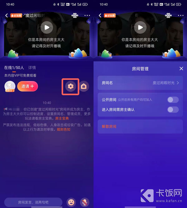 4、点击屏幕右侧的齿轮【设置】可修改房间名称、是否公开房间、进房间是否需房主确认、解散房间等等;