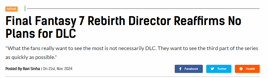 《FF7重生》总监透露:专注完整三部曲,无DLC计划!