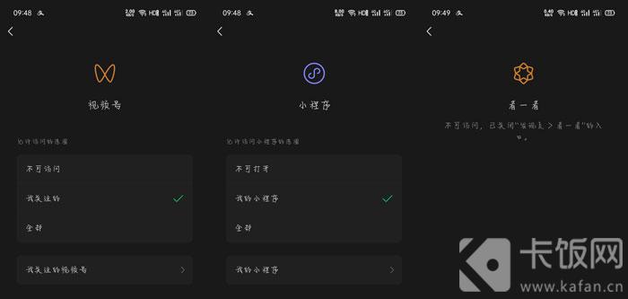 8、例如“视频号”,可选择“不可访问”、“我关注的”、“全部”等三个权限,如果我们没有或者已经关闭了如果,则显示“不可访问”;