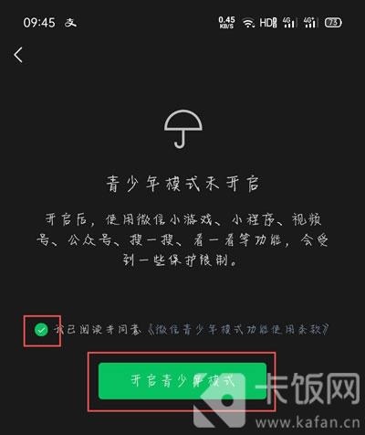5、勾选下方的【我已阅读并同意《微信青少年模式功能使用条款》】,选择【开启青少年模式】;