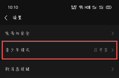 3、然后在微信设置中,选择【青少年模式】,此时也可以看到青少年模式正开启;
