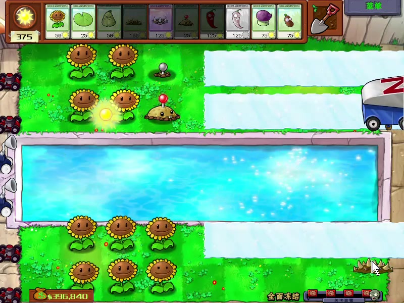 在全面冻结这一关,僵尸会在冰冻地带陆续出现,因此必须确保开局快速布置阳光菇或太阳花,以尽快积累足够的阳光。可以布置一至两排坚果墙,特别注意保护好你的阳光产出植物不被僵尸直接攻击。