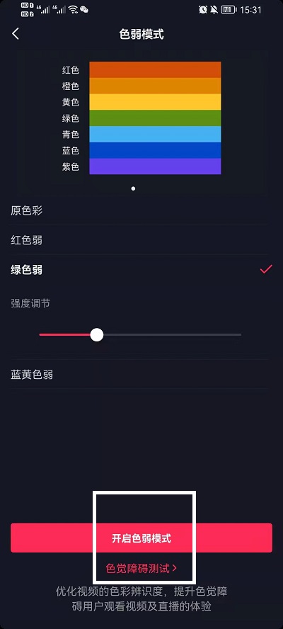 5、在其色弱模式中,就可以进行更加详细的色弱设置,点击某个色弱,还可以调节其强度。