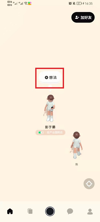 1、打开啫喱软件,然后在软件的首页界面中,点击自己角色头上的【想法】进入到想法添加界面中;