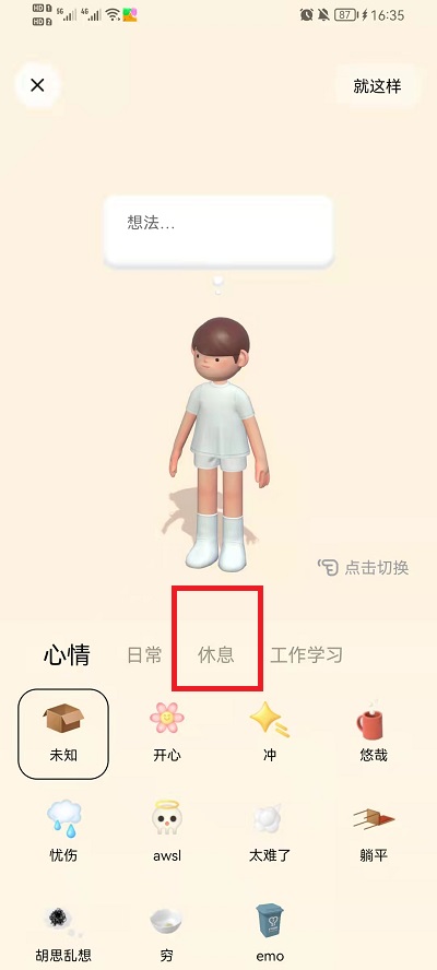 2、在想法界面中,点击【休息】切换的休息想法中;