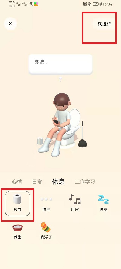 3、在此想法分类中,我们需要点击【拉屎】就可以完成操作,点击右上角的【就这样】就可以保存,双方同时进行设置就可以。