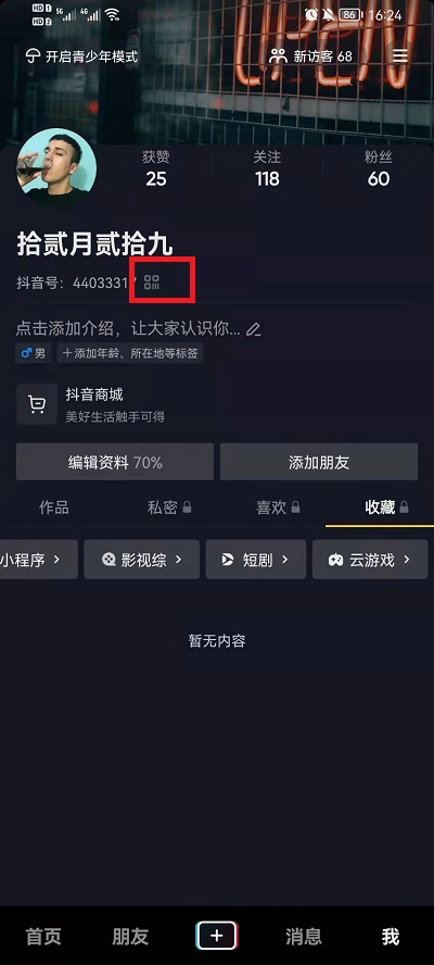 2、然后在自己的主页之中,可以看到自己的抖音号,在抖音号旁边就有一个非常小的二维码标志,点击此标志就可以进入到二维码界面中;