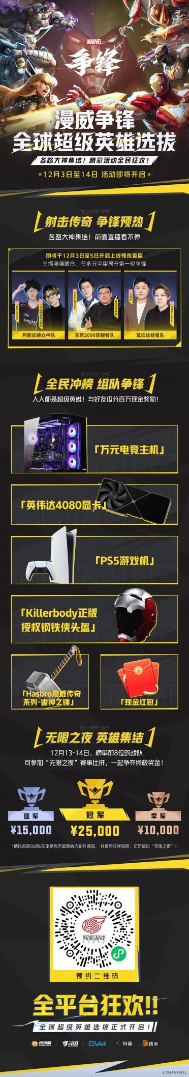 与此同时,《漫威争锋》正式开启全球超级英雄选拔活动,众多好礼等你来拿。即刻前往官网预约公测,12月6日化身超级英雄,与全球玩家一起点燃战斗!