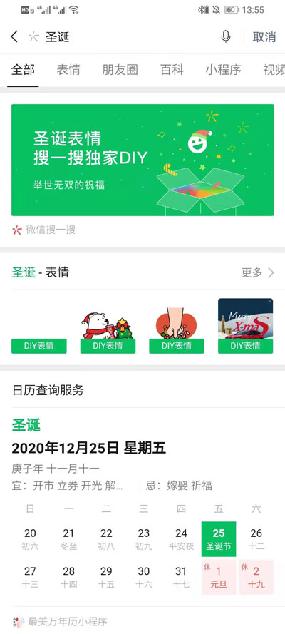 1、升级微信版本到安卓6.3.32及以上和iOS 6.5.1及以上,在微信搜索框搜索“圣诞快乐”四个字,点击搜索;