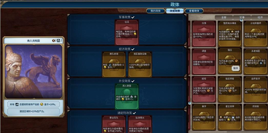 投资文化的同时也不能忽视科技的发展,美国特色的国家公园能吸引游客,增加旅游胜利点数,所以在保障科技进步的基础上,要适度加大对文化的投入。尽量加快对“政府广场”这一区域建筑的研究速度,以便尽早建立起并升级专用政府形式,从而获得不同的政策加成。
