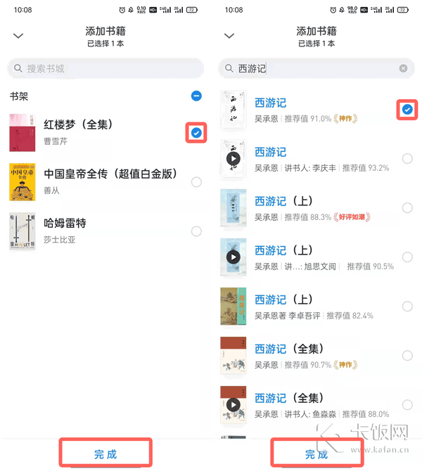 5、勾选需要导入的书籍,可通过书架、搜索等方式查找书籍,选中后点击【完成】即可。