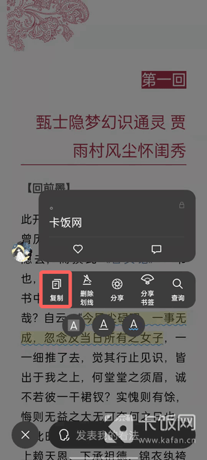 4、点击笔记会弹出菜单,选择【复制】即可摘录句子;