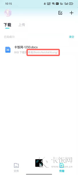 2、下载完成的文件在【传输】的【下载】中查看到信息,即可查看到下载路径为【本地/BaiduNetdiskYoung/】;