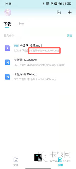 2、在下载完成后,通过【传输】页面找到下载记录,同时可以看到下载路径为【本地/BaiduNetdiskYoung/】;