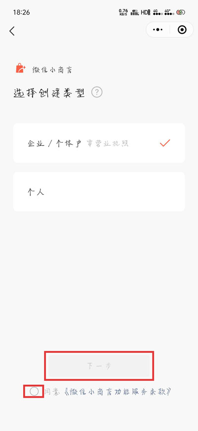 2、然后选择微信小商店的店铺类型,分为:企业/个体户、个人,勾选下方的【同意……】,点击【下一步】;