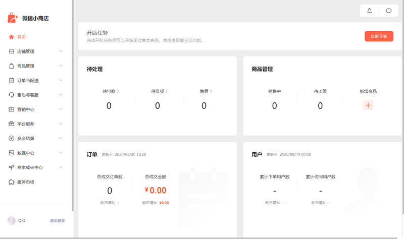 5、最后在网页上即可管理我的微信小商店了(注意,刚创建好的微信小商店,需要在“首页”点击【立即开张】去完成开张任务才可以发布商品获得收益);