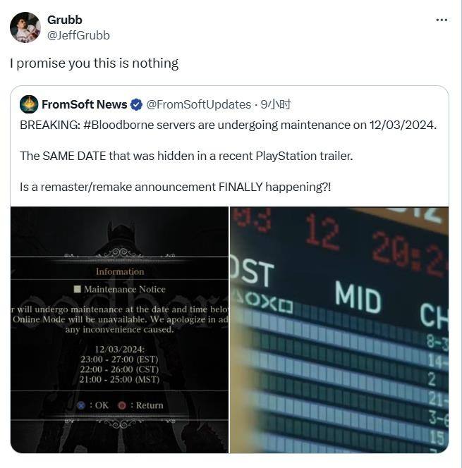 这个维护信息是真实的,但是维护日期与活动在同一天发生,难道只是巧合?还是将会有其他的事情发生?玩家们一直心心念念《血源诅咒》能够登陆PC,或者推出重制版,而这次的服务器维护很有可能是要宣布《血源诅咒》重制版的消息。