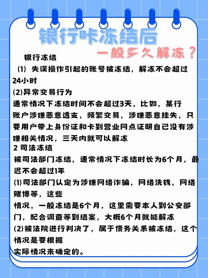 4、账户情况:如果用户账户存在异常,如近期有多次大额交易、账户历史记录不佳等,银行可能会延长冻卡时间进行深入调查。