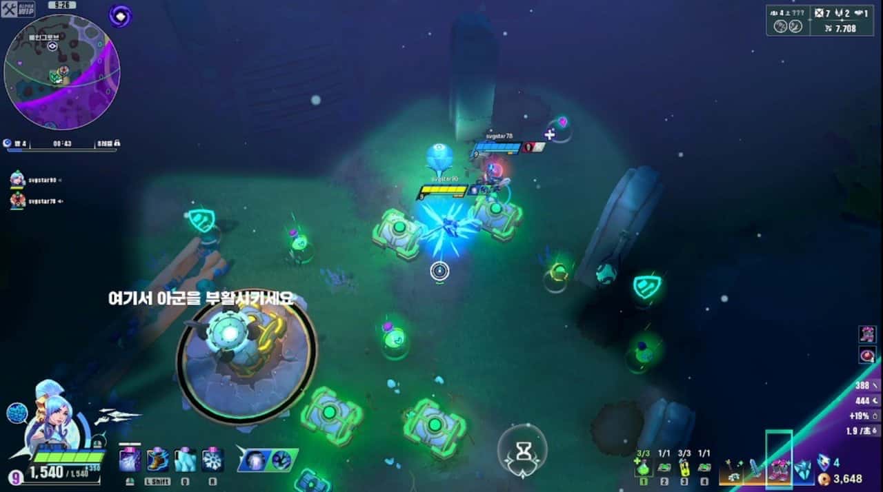 游戏采用俯视视角,操作设计则更偏向动作射击。 玩家利用[W/A/S/D]移动,鼠标控制射击方向,并以快捷键(如[Shift][Q][R])施放技能。 此外,游戏加入跳跃操作,让玩家能在地图间自由移动,甚至进行空中战斗,显示了更高的动作性与灵活性。