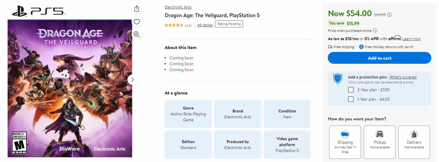 《龙腾世纪4》的版本在沃尔玛首次出现了折扣,这款游戏上市不到一个月就从70美元降到了54美元。尽管初期有媒体给予了较高的评价,但玩家反应冷淡,Metacritic评分仅为3.8分。尽管EA进行了大力宣传,但游戏的销售表现并不尽如人意。据知情人士透露,自发行以来,《龙腾世纪4》的销量大约在50万到100万份之间,并且还有约3万份游戏被退回。外界推测,销量不佳和TGA上的冷落可能是导致游戏打折的重要因素。