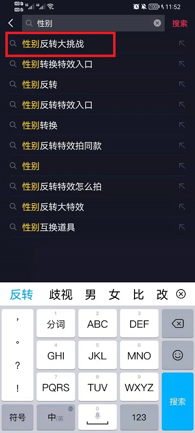 2、我们需要在其中输入【性别反转大挑战】,然后点击搜索,或者是直接点击下方的提示去进行搜索;