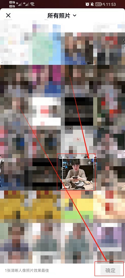 4、点击后会进入到我们的手机相册中,从手机相册找到一张脸部露出比较多的照片,然后点击右下角的【确定】进行生成;