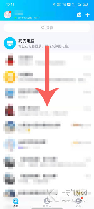 1、打开手机上的QQapp,登录你的QQ账号,在消息页面按住下拉打开QQ小程序;