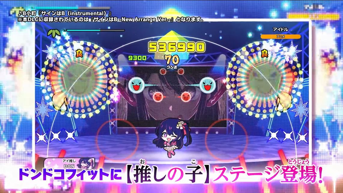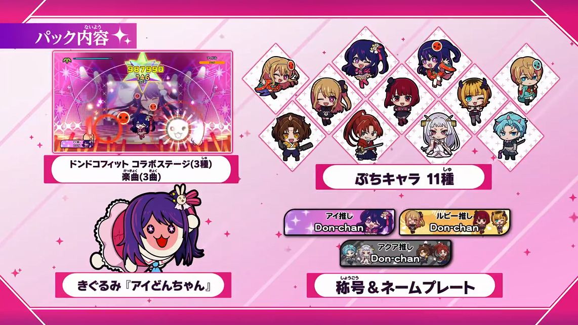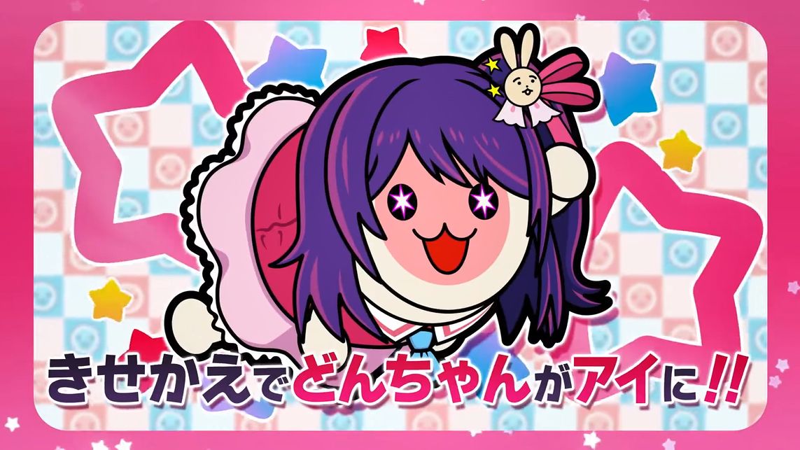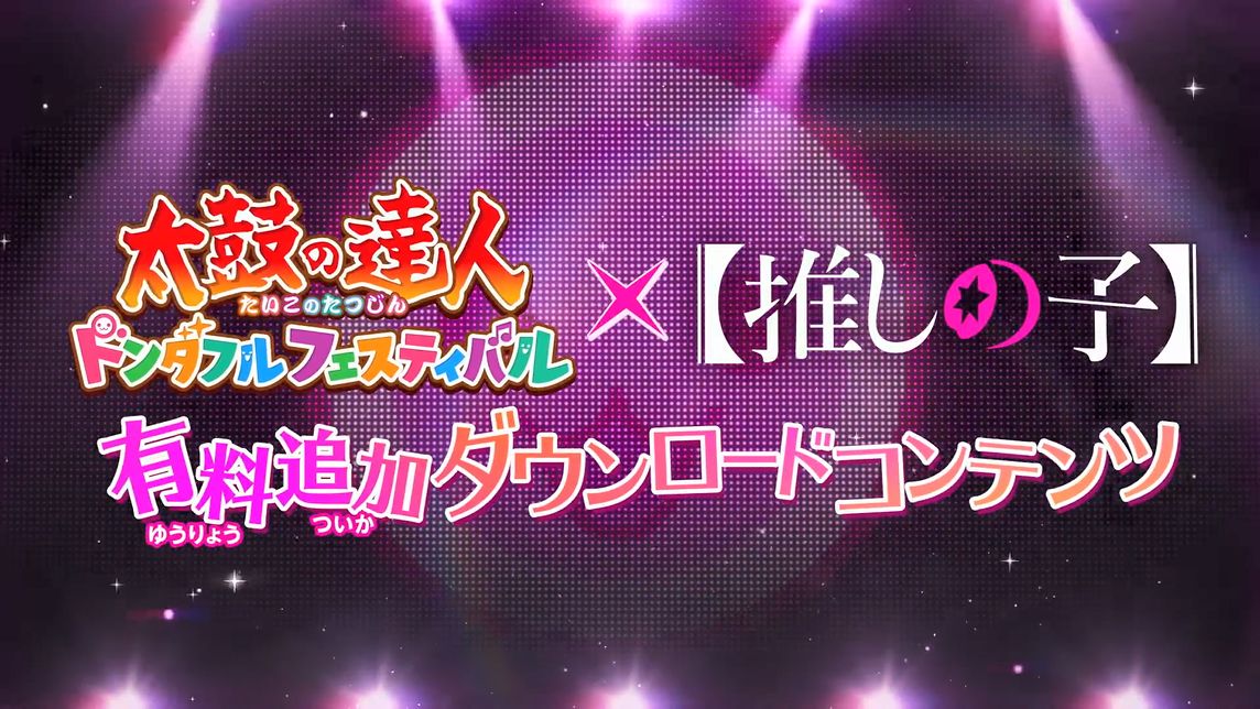 《太鼓达人》×动画《我推的孩子》的联动是收费DLC,DLC将包含三款特别舞台、三首动画曲目:《アイドル》、《サインはB -New Arrange ver.- 》、《ファタール》,还有“爱咚酱”、11款Q版造型、3款联动铭牌和10种称号。