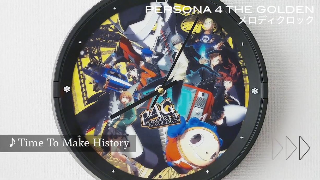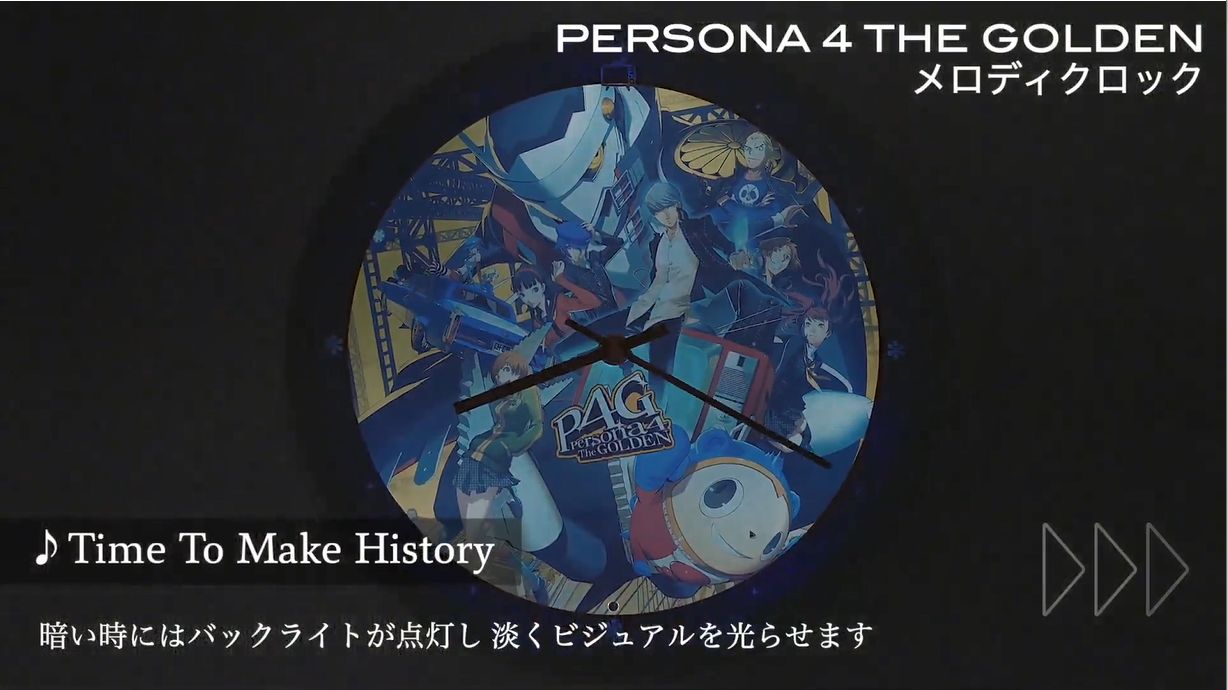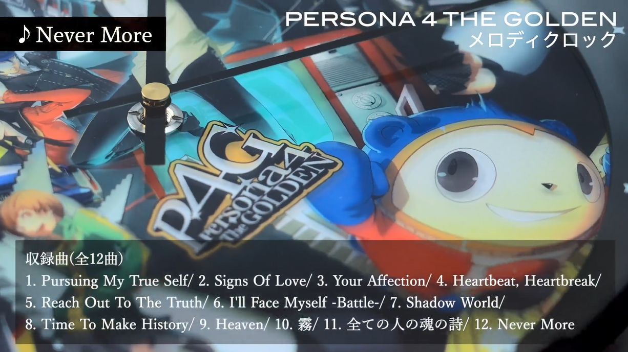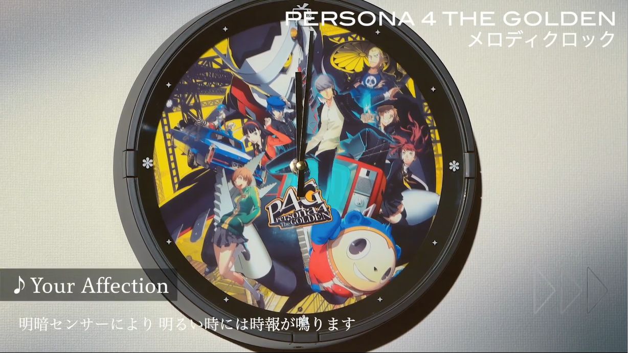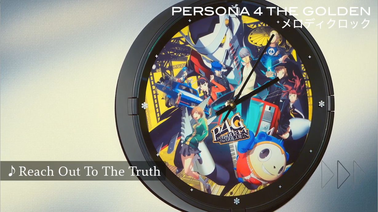 《女神异闻录4:黄金版》旋律时钟中内置了《Never More》、《Reach Out To The Truth》、《Your Affection》等12首经典曲目,与之前《P3P》的时钟规格相同,也可以通过明暗感应器在白天播放音乐报时,夜晚自动打开柔和的背景灯。