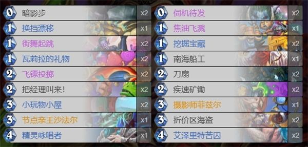 在这一构筑中,新加入的“摄影师”可以有效防止“法术迸发”将增益效果错误地传递给船工,避免无法回手的尴尬局面。卡组的灵活性得到了增强,“礼物”替换掉了“背刺”,让你在对局中能够更随意地应对各种情况。新加入的“街舞起跳”也提供了更多的斩杀机会,或帮助你在关键时刻回手南海船工。